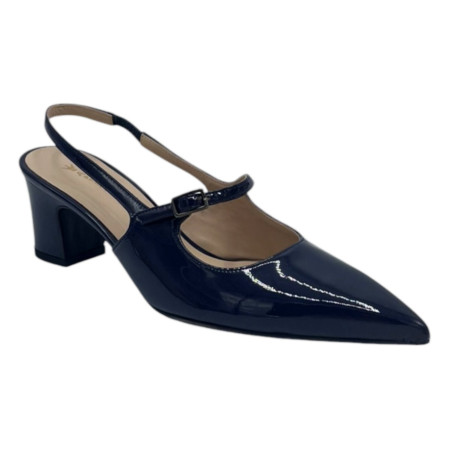 Κλασική δερμάτινη slingback γόβα σε λουστρίνι, με στρογγυλεμένη φόρμα και σταθερό τακούνι. Θηλυκή και διαχρονική επιλογή.