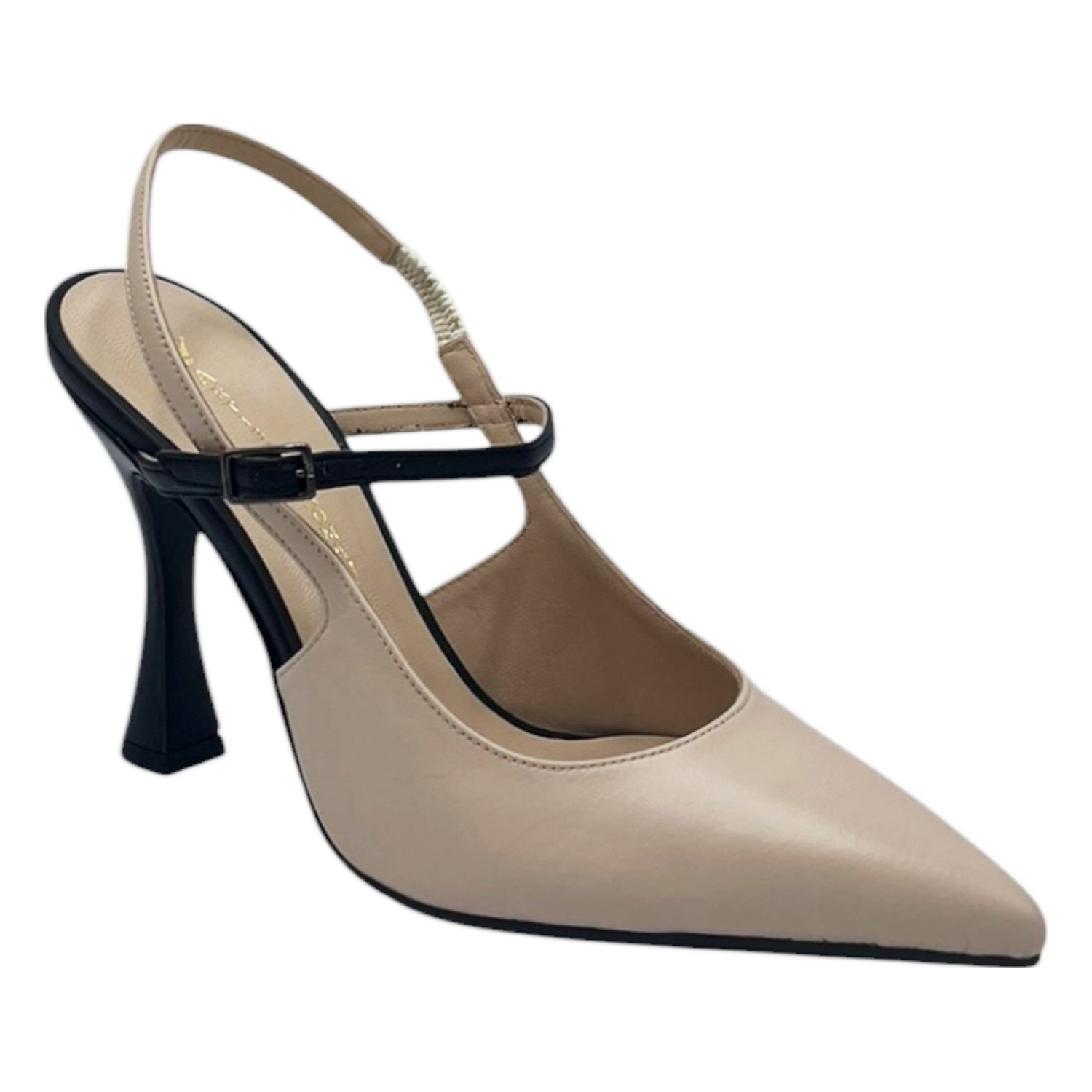 Η Aurora αποπνέει καθαρότητα και διαχρονική κομψότητα. Το μπέζ δέρμα σε αντίθεση με το μαύρο τακούνι δημιουργεί ένα αρμονικό παιχνίδι φωτός και σκιάς. Το λεπτό λουράκι αγκαλιάζει διακριτικά το πόδι, προσφέροντας άνεση και σταθερότητα, ενώ η μοντέρνα γραμμή του τακουνιού δίνει μια σύγχρονη πινελιά σε ένα κλασικό σχέδιο. Ένα παπούτσι που μετατρέπει κάθε εμφάνιση σε statement κομψότητας.