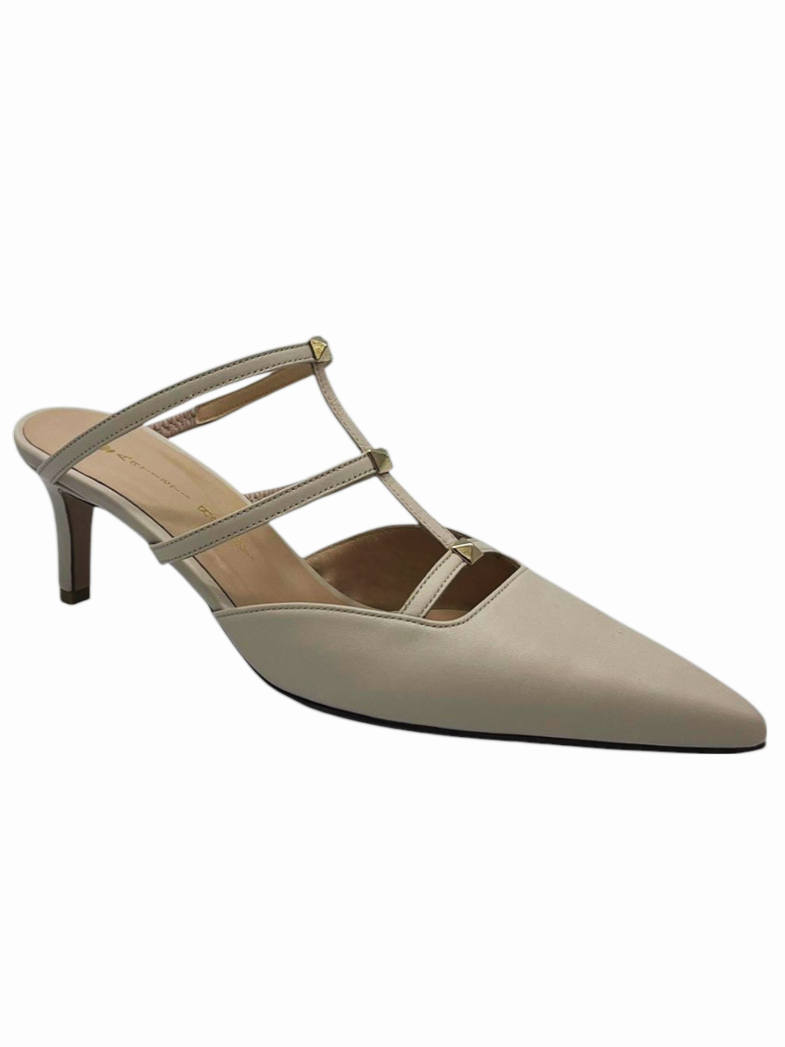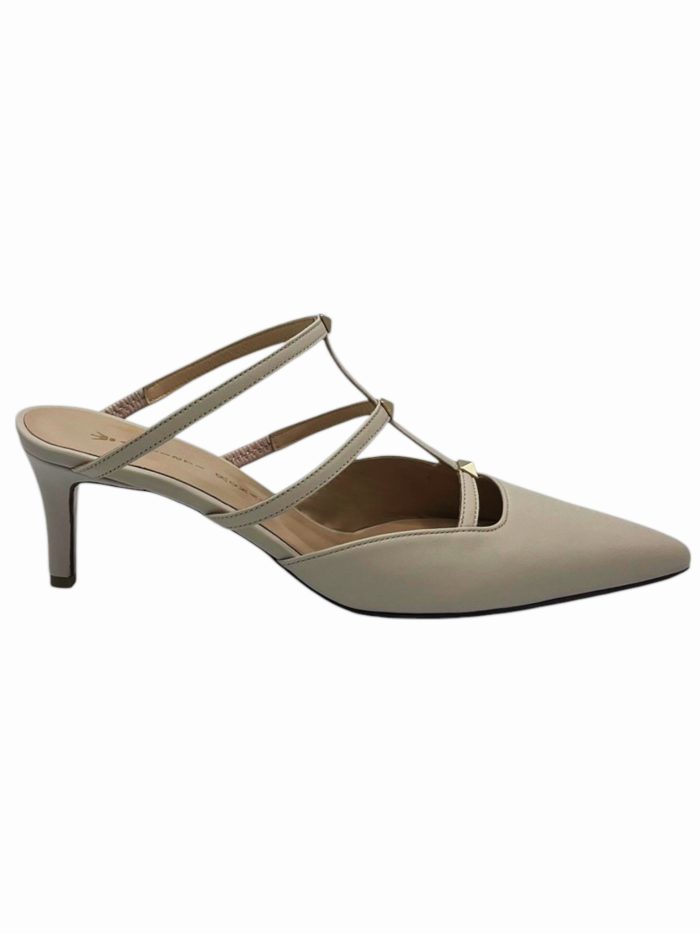 Κομψό mule με μυτερή φόρμα και χιαστί λουράκια που αγκαλιάζουν διακριτικά το κουντεπιέ. Οι μεταλλικές λεπτομέρειες προσθέτουν εκλεπτυσμένη λάμψη, ενώ το μεσαίο τακούνι προσφέρει ισορροπία ανάμεσα σε άνεση και θηλυκότητα. Ένα σχέδιο που εκφράζει διαχρονική κομψότητα και μίνιμαλ αισθητική.